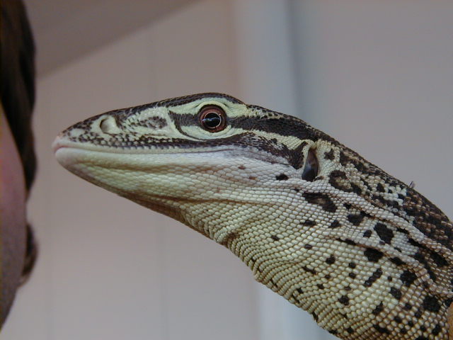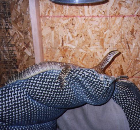 Argus monitors are fairly high strung animals. Some of them can loose their fear of human beings, but they will always be nervous and prone to startle. Also, even when they have accepted that you are not going to hurt them, they will still be active and squirmy when held. None of mine are content to just sit and hang out, they will want to climb all over you, dig up your hair, excavate your nostrils, forage in your pant-sleeves, stick their nose in your ear openings, make flying leaps for inviting looking perches from your shoulders, and so on. They may not be the tamest monitors, but the same hyperactivity that makes them so high strung and excitable is also what makes their antics so fun to watch. Among my animals, the females seem more high strung than the males, but I have too small of a sample size to say if this is universal among argus monitors or not. Like all monitors, however, the hatchlings and juveniles are extremely squirmy, paranoid, jittery, and edgy. These youngsters are pretty much untameable. They mellow out as they mature, though. By about nine months of age, a well fed argus monitor will be entering sexual maturity and will start to calm down a bit. By two years, it will be considerably more relaxed than that tiny baby you started with.