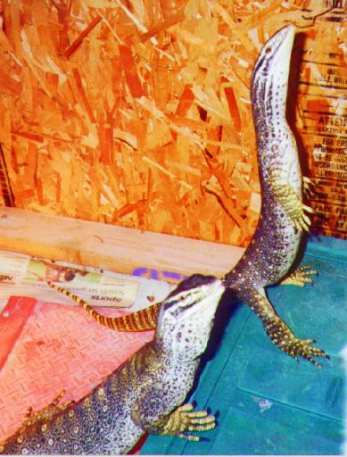 Possibly related to this intelligence, argus monitors have social abilities above that of most other reptiles. They can recognize others as individuals, and quickly form oppinions on who they can and cannot trust. They seem to form pair bonds, with females accepting a known male and mating only with that male. The male, on the other hand, is quite promiscuous, but although much larger, he does not attack and eat "his" females. The females can also recognize their own nests. They will happily eat the eggs of other females, but not their own. They even defend their nests from other monitors and sometimes even much larger predators for a short time (at least) after laying eggs. As hatchlings, all the monitors from a single clutch will hang out together in the same tree or same general area. The social bonds they form with their siblings are said to last for life, those siblings who survive are trusted as adults. In my experience, males rarely get along with strange males, and females rarely get along with other females. Females are often scared of strange males, but if the male does not try to kill the female and she has not yet bonded with another male, she may accept that male as a mate. If she has already bonded with another male, she may act agressively towards the new male and try to drive him off. Social situations are always complex, and there will be more variety and confusion that these general rules I list here seem to indicate, but these are some of the things that I have observed with my monitors.
