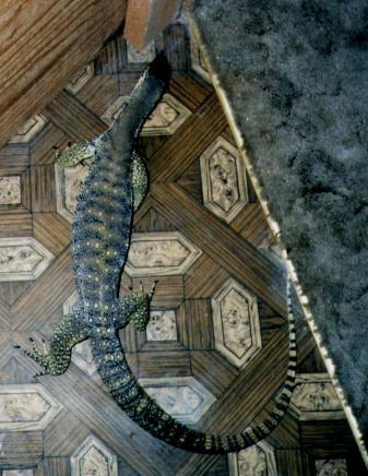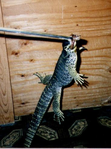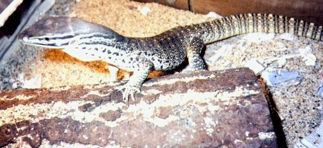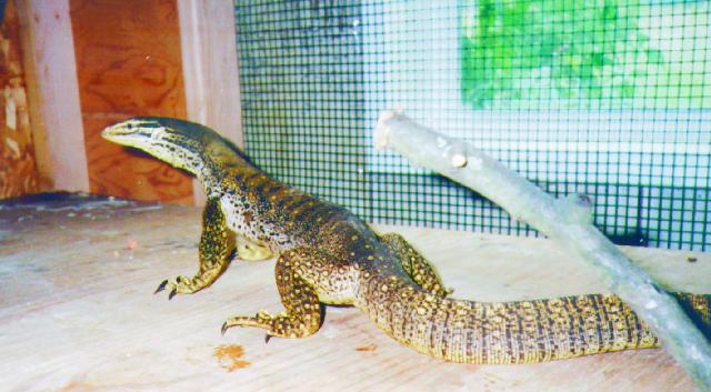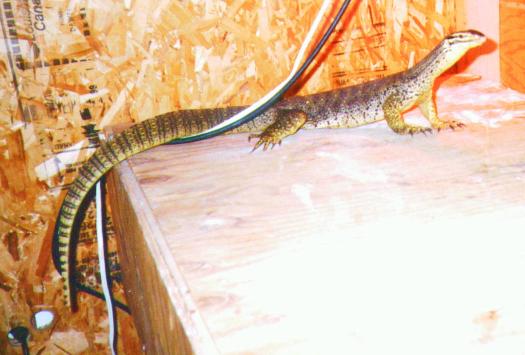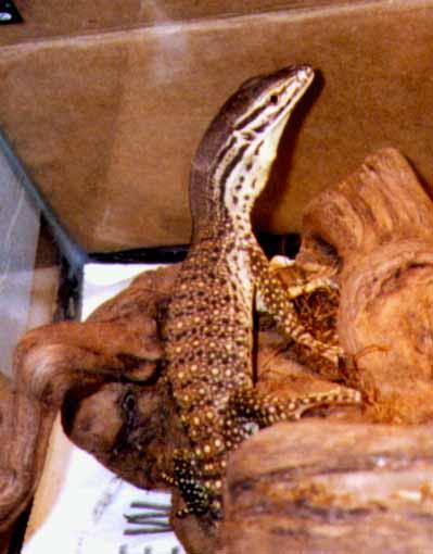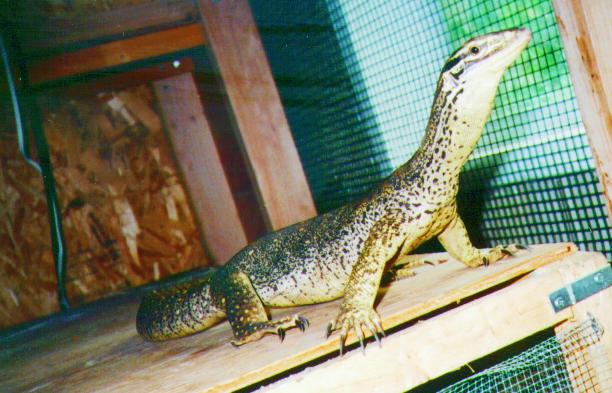 Chris is still around, though, amusing me with her antics. She has the run of the living room in my appartment, which she shares with Hall, my big male. When she is not climbing the furnature or exploring every nook and cranny, she is usually basking under the various basking spots I have set up about my place. She once had a brush with a disease that looked, at first, like the same thing that killed Super-K, but she came through it without a problem. With any luck, she has a long life ahead of her, and will be the mother of many more argus monitors.
