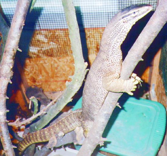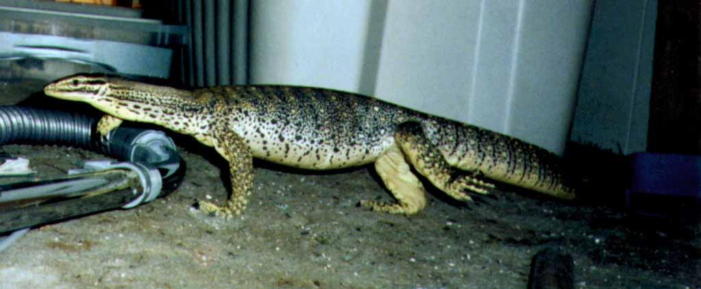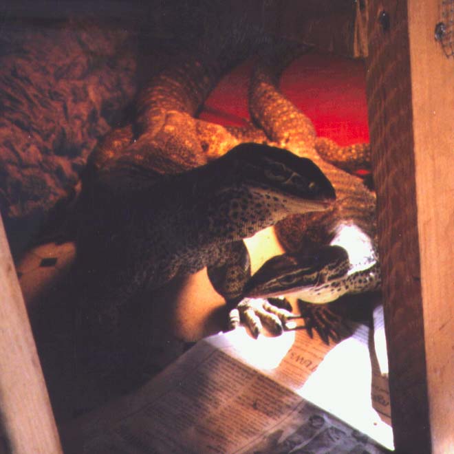 May 7, 1999. My new housemate keeps and breeds large numbers of Guinea pigs. Sometimes, one of these dies, and I, or rather the monitors, get the remains. The first time I tried feeding a Guinea pig to Hall and Chris, Chris attacked it but had a hard time getting through the thick skin and all the long hair. By clawing and shaking, she eventually managed to rip through, but it took a long time. Hall wasn't much help. He was too timid when Chris was flinging it about, and was missing too many of his front claws to effectively dismember it. I left the carcass in the cage while I went off and did other things. It turns out that the monitors eventually got tired of trying to separate off bite sized bits and just left most of the remains sitting on the heat mat underneath the basking light. By the time I got back, the place stunk to high heaven!