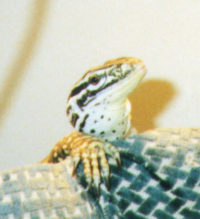 April 27, 1999. After the big move, from my apartment in Seattle to the house in Montlake Terrace, Oz seems to be doing fine. I hauled her couch over to put in her new cage, and she hides in it and basks on top of it just like before. I think she is gravid once again.