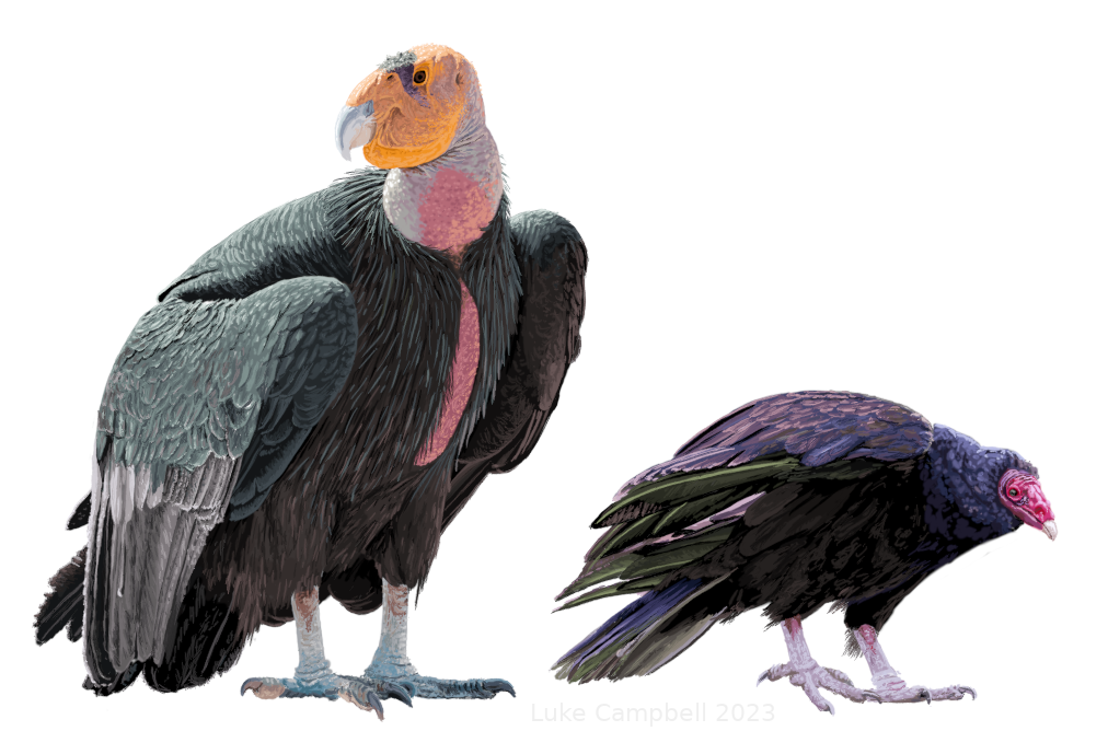 Cathartid Vultures: Cathartids are not closely related to the Gypaetine or Aegypiine vultures, but have congerently evolved many of the same traits. These are soaring birds that use their excellent eyesight and acute sense of smell to locate carcasses from their high vantage points. Pictured are the California condor and the turkey vulture.