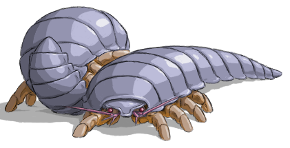 Steamroller: The steamroller is a large Mant domesticate, used for meat and, in the past, traction. It is a herbivore with a cranky disposition. Heavily armored with thick chitinous plates, when frightened it will curl up into a ball for protection and squirt out clouds of an irritating aerosol that acts like tear gas. It is also capable of rolling over hard, level ground like a wheel by curling most of the way up but letting its legs stick out, then kicking with its legs for propulsion. Its normal gait at low speeds or in rough terrain is simply walking on its eight legs.