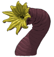 Sunflower Worm: A common pest of Mant hive houses, particularly when they infest the fungus gardens. Sunflower worms are omnivorous, mature rapidly, lay hundreds of eggs, and pack a painful defensive bite with a mild venom. When threatened, they rear back and open their lip-tentacles, revealing the vivid yellow of their mouth's interior as a warning. Large individuals can reach 2 meters resting length, but most are sexually mature at 40 cm long. They are attracted to areas with food, cover, and water, particularly food storage areas and garbage. They are now a common pest of Human and Gummi houses as well as those of Mants.