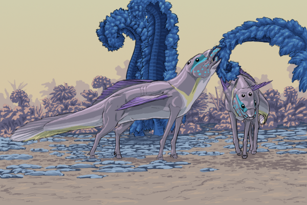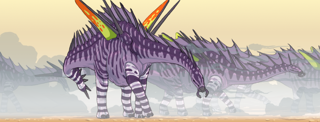 Oolon whooies are the largest animals of Zhiroom. A Human could walk underneath their bellies without mussing his hair. They have a similar body plan to the ancient Earth sauropods and stegosaurs, with long necks, long tails, pillar-like legs for bearing their weight, and many spikes on their fins and frills to deter predators. Oolon whooies gobble up huge amounts of vegetation which is digested their large fermenting stomachs.