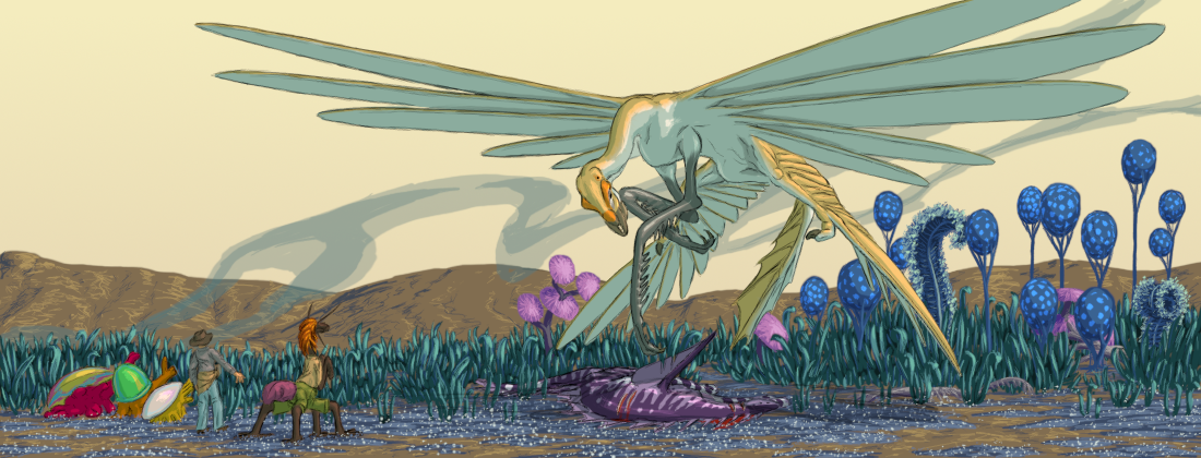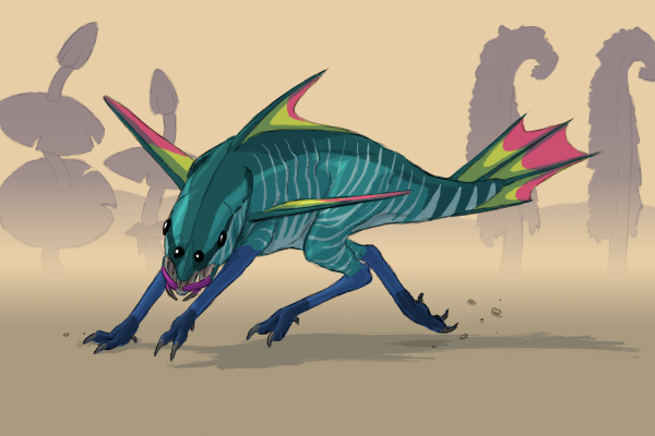 The gluophfan-oo is the largest known heavier-than-air flying animal in the Verge. Even with Zhiroom's dense atmosphere, gluophfan-oos are only found in the lower gravity equatorial regions. They soar long distances, scanning the ground for prey. Their wing-fins primarily provide lift, although they can be fanned apart to give a multi-wing configuration for high lift at the expense of even higher drag during low speed flight. The gluophfan-oo primarily derives thrust by beating its hind leg-wings.