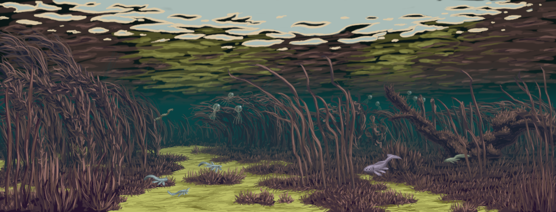 Zhiroom's freshwater environments are host to numerous species of underwater vegetation as well as fish-like, worm-like, and radially symmetric organisms.