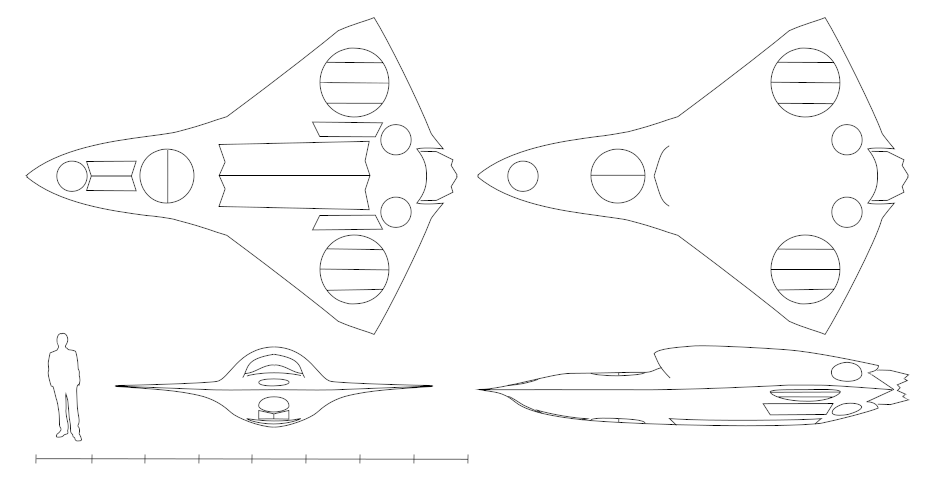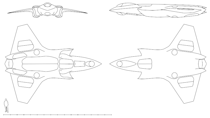 It uses a delta-wing lifting body shape without vertical tail fins, looking like an ominous black triangular dart when de-cloaked.