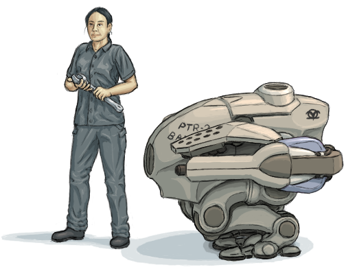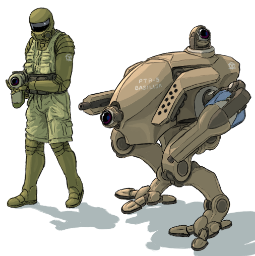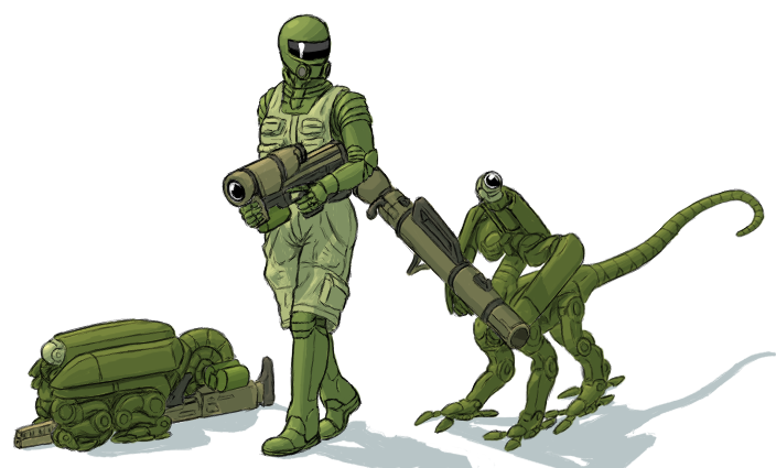 | Attacks| Description | Type | Pen | Wound | AP | Sharp | Blunt | Def | Length | Grip | | Strike | Smash | -9½ RS | +½ | +0 | +0 | +½ | +0 | 0.6 | +0 | Ranged Attacks| Description | Pen | Wound | AP | ROF | Shots | Bulk | Aim | Range | Speed | | — Chose either | | Battle Laser | 28 | +1 | -4 | 3 | 1000 | +0 | +12 | +12 | c | | — Or | | Big Game Laser | 35 | +1¾ | -4 | 1 | 400 | +0 | +13 | +13 | c | | — Chose either | | Needle Rifle | 32 | -1 | -7 | s,b3 | 60 | +4½ | +7 | 120 | 400 | | — Or | | RPG – kinetic | 380 | +3¾ | -7 | 2 | 2 | +6 | +8 | 6k/1.8k | 70 | | blast | -1 RS | | (7) | | | | | -½ | | | RPG – explosive | +2 RS | | (7) | | | | | +2 | | | contact | 35 | +12 | (7) | | | | | | | Armor| Description | Protects | Armor Score | Blunt | Pad | Activation | | Body Panels | 1-10 | -8½ | -1.5 | 0.6 |