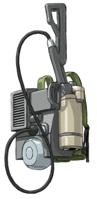 - Heavy Laser Pack: A laser pack with a powerful beam for long range fire or taking out equipment, light armored vehicles, or heavily armored individuals. As with other laser packs, the beam generator and energy storage are worn in a back pack, and the beam routed to a hand-held beam pointer through a cable.