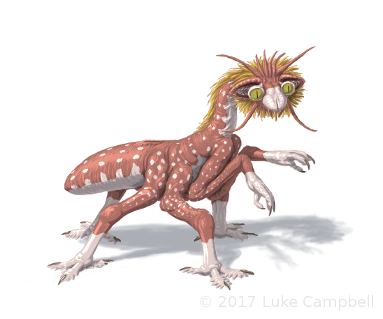 Pirangs have a centauroid body plan, walking quadrupedally on four legs with two arms on their torso. A long neck stretches from their shoulders, with a mane down the back and around the head. The Pirang head is fringed by tentacles, with two large ears, two eyes, and a mouth that opens horizontally.