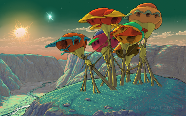 Tweechi dwellings are built using basic Gummi methods, but are built in high places – often on tall poles if no suitable cliff or tree is around. Their nests are much more open than a Gummi house, with large windows offering an expansive view. Tweechi nests will usually have an outdoor porch, with an overhang sheltering grips from which Tweechi can hang.