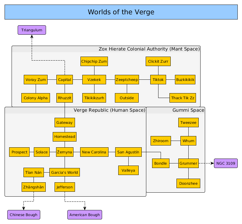 | | A connection map of the important worlds of the verge. Solid lines indicate a wormhole connection between the two worlds. Dashed lines indicate an important former wormhole, now broken. Many wormhole routes pass through one or more uninhabited or lightly inhabited worlds which are not shown. There are also additional wormhole routes to minor outposts and stations that are not displayed on this map.