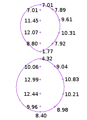 A gravity map of Bondle (bottom) and Pbliiuwho (top), with local gravity measured in m/s² at selected points (indicated with + signs). The spin axis is perpendicular to the page.