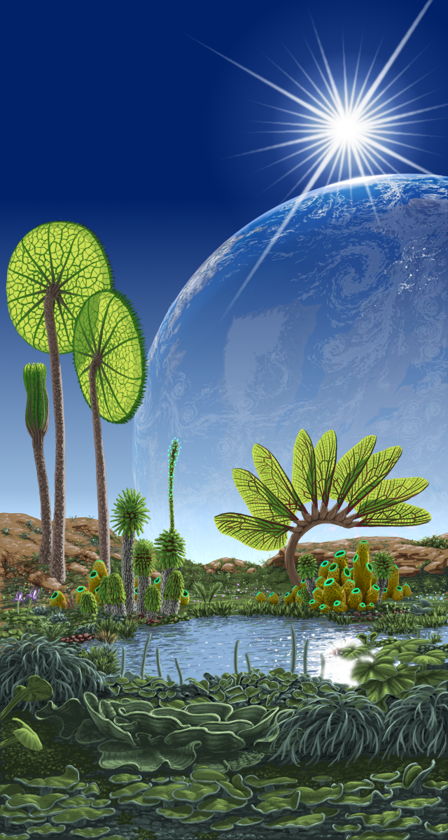 Valleya is covered in vigorous life, with towering forests, windswept plains, rocky scrublands, steamy jungles, and vibrant reefs. The vegetation uses the same green chlorophyll as Earth plants, and is notable for growing extremely rapidly (comparable to bamboo and kudzu). Much of the flora uses bio-luminescense to attract polinators, giving them flowers, and even stalks and leaves, that glow in a variety of colors. Animal life features impressive megafauna along with the usual creepy-crawlies. The megafauna were primitively hexapedal, but many have since evolved a bipedal or quadrupedal gait with extra limbs used for grasping or flight.