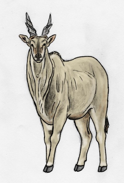 The two species of eland are large african bovids with robust bodies, humped shoulders, and spiral horns. They inhabit open country, where their keen senses can detect enemies from a long distance away. Elands can easily jump most fences. They are primarily browsers. Elands group together in numbers ranging from a few to several hundered. Often, several males will accompany a herd of females. Young elands will typically form herds with others of their own age.