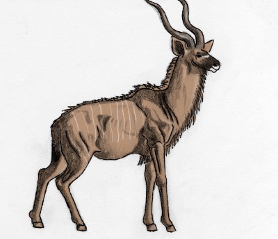 The kudus and relatives are mid sized bovids characteristically marked with white stripes or spots over a darker ground color. Crests of hair often run along the spine or underside of the neck. The horns point back, and are often heavily spiralled. Kudus and their kin are usually found only near heavy cover, and rely on concealment for security. The Kudus proper are known for making spectacular leaps. Others in this family are semi-aquatic and well adapted for swimming and traversing muddy terrain - the sitatunga is even known to hide underwater with only its nostrils exposed. The bongo is particularly adept at running through tangled brush and growth. All are browsers.