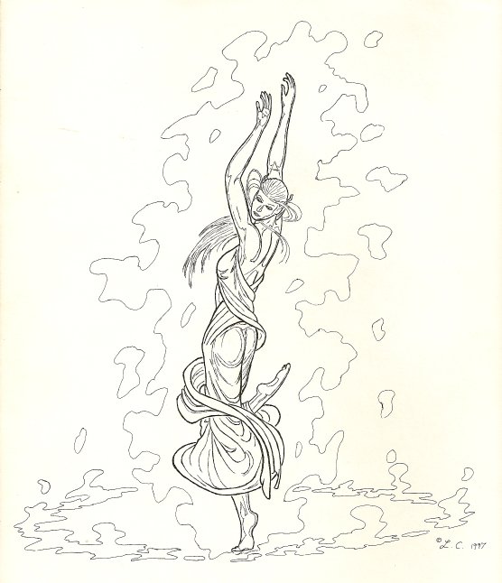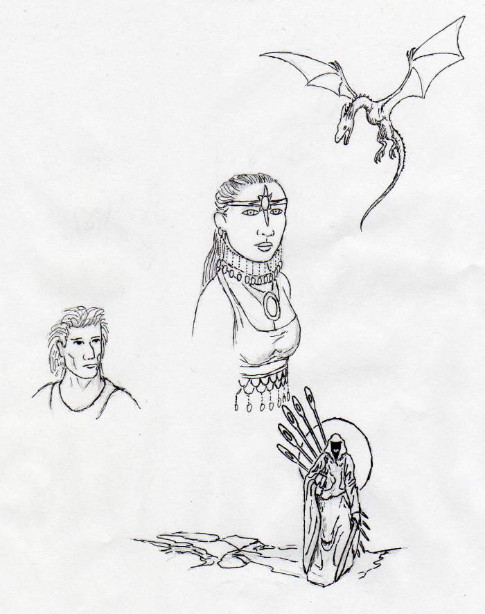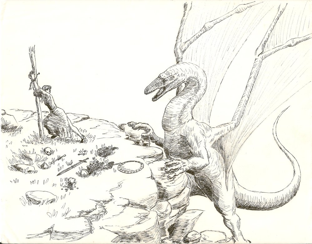 I had this idea of illustrating a book where an innocent maiden is sacrificed by frightened townsfolk to appease a ravening dragon, only to have the dragon befriend the maiden and the two of them go on adventures together. I only got the first drawing done.